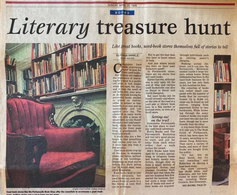 Article about used bookstores in the Portsmouth, NH area in 1999.