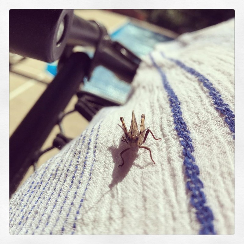 …i am once again a magnet for insects. A sweet grasshopper saying hello. A great start to summer by the pool. #insectlady