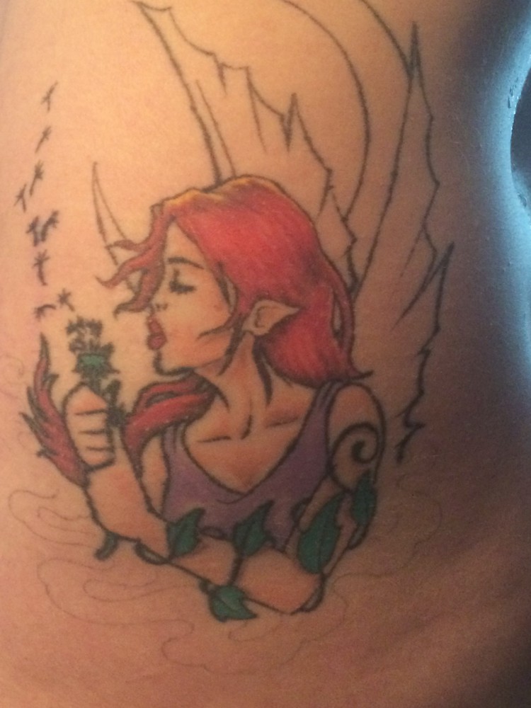 The most pain I had from the experience was my arm falling asleep cause I had to lay on my side, and my leg cramping up a bit. I was quite impressed with how it turned out, though it’s not finished yet.The fairy is done, but color still needs to be added to her wings, the moon, and the smoke that she’s wrapped in.